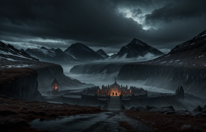 Welcome to Niflheim, the realm of ice and mist. Niflheim is a desolate and inhospitable realm, known for its frozen landscapes, eternal darkness, and icy winds that cut through your very soul. It is a place of primordial coldness and the birthplace of the very first beings in Norse mythology.
